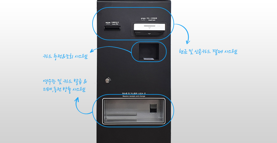 K215B는 카드결제(IC/MSR)기능 외에 현금결제 기능을 더하여 모든 결제수단이 가능한 스마트 키오스크 모델이며 사용자의요구에 따라, 카드방출기능이 포함된 제품도 가능합니다.